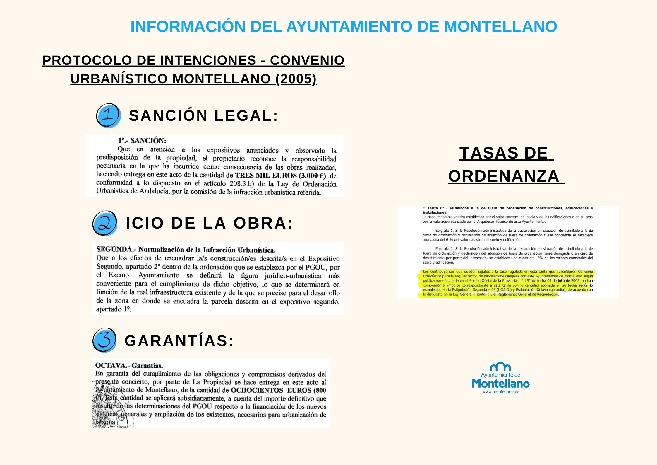 En los últimos días se ha generado en Montellano cierta preocupación y confusión en relación a los Protocolos de Intenciones - Convenios Urbanísticos (https://drive.google.com/file/d/1CSilIt9ZGtSSe-_Yz4De4YF2xgVGzEUc/view?usp=share_link), firmados en el año 2005 entre el Ayuntamiento de Montellano y distintos propietarios de parcelas y construcciones situadas en suelo no urbanizable. Ante las informaciones aparecidas y con el objetivo de ofrecer una explicación clara y transparente, el Ayuntamiento de Montellano considera necesario trasladar a la ciudadanía la siguiente información.