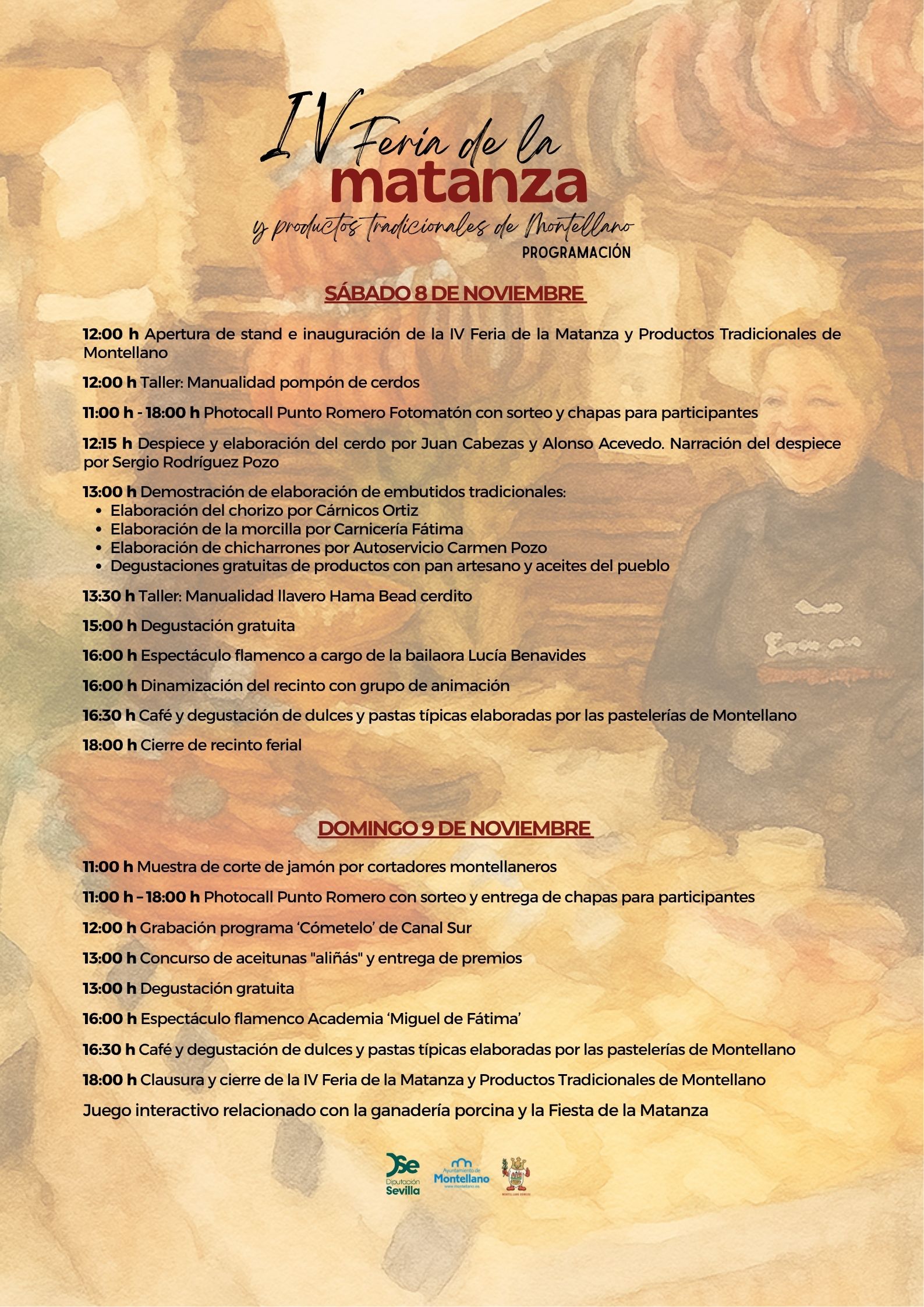 La programación dará comienzo el sábado 8 de noviembre a las 12:00 con la apertura de los stands y talleres infantiles. A lo largo de la jornada se realizará el tradicional despiece del cerdo y demostraciones de elaboración de embutidos, así como diferentes degustaciones. La tarde continuará con animación para todos los públicos, actuación de flamenco interpretada por Lucía Benavides y degustación de dulces tradicionales, finalizando la jornada a las 18:00.