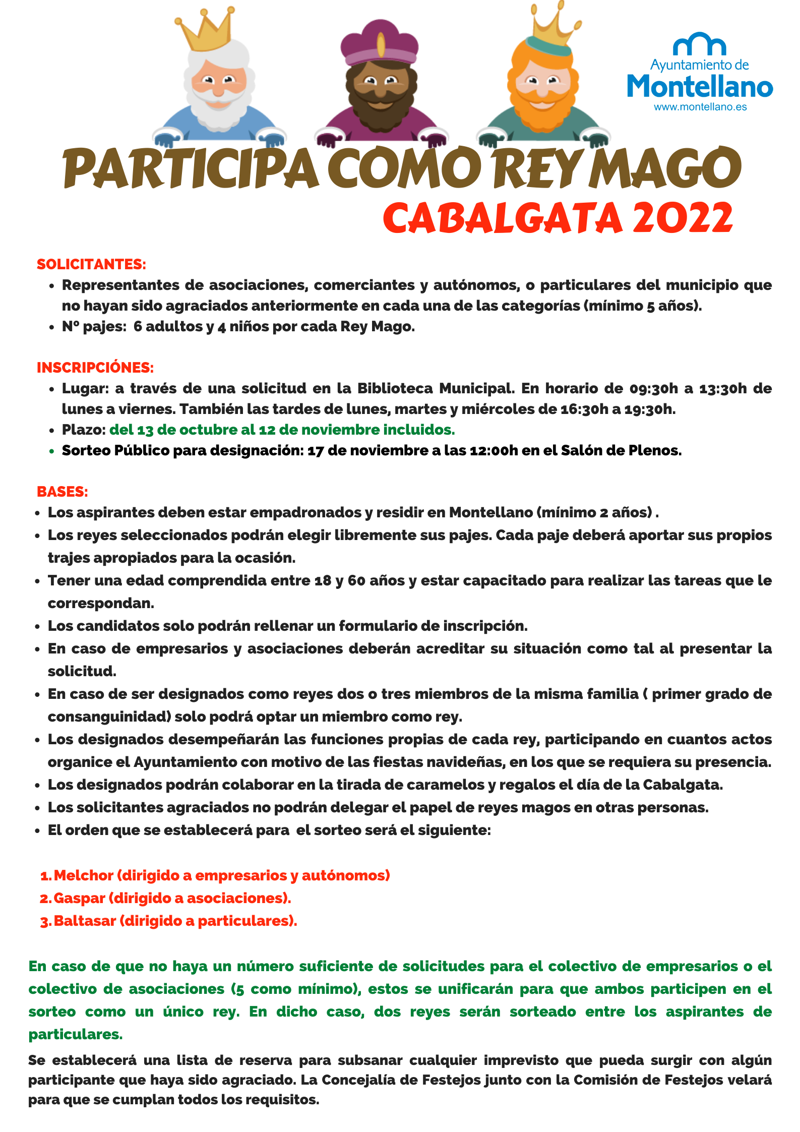 Hasta el 12 de noviembre de 2021 queda abierto el plazo para solicitar ser rey mago en la Cabalgata de Reyes Magos 2022 de Montellano, que se elegirá mediante sorteo público el 17 de noviembre.