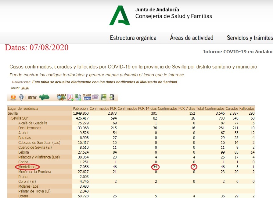 Se han vuelto a actualizar los datos de contagiados por COVID-19 en Montellano. Según publica la Junta de Andalucía en su web, son 34 los confirmados en los últimos 14 días y 2 en los últimos 7 días.