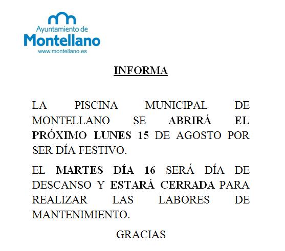 El próximo lunes 15 de agosto, al tratarse de día festivo se abrirá la Piscina Municipal. Como consecuencia el martes día 16 premanecerá cerrada para realizar las correspondientes tareas de mantenimiento.