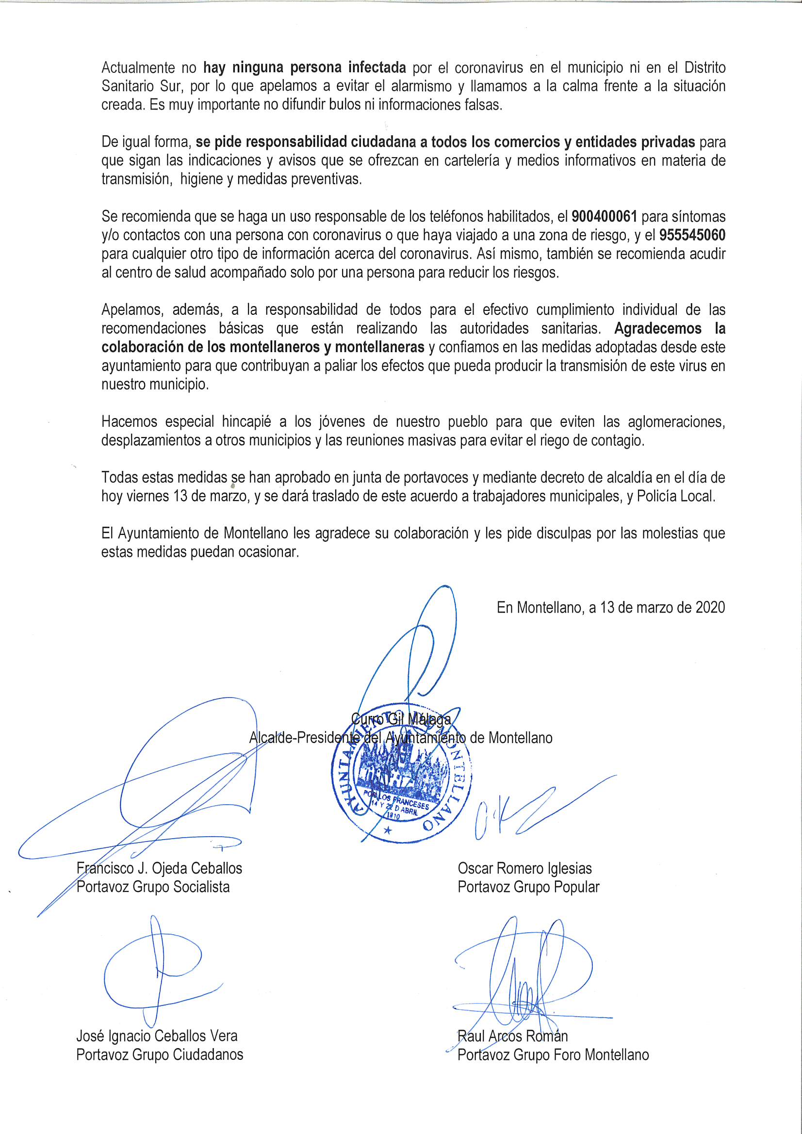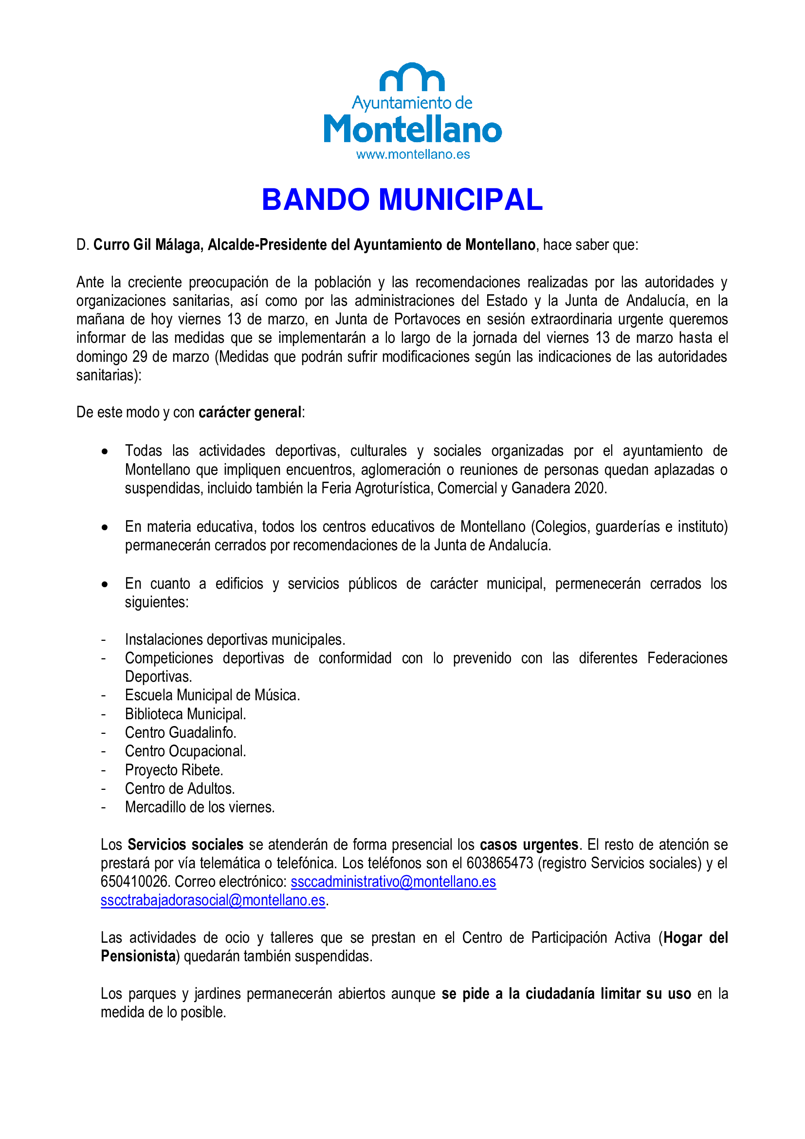 Ante la creciente preocupación de la población y las recomendaciones realizadas por las autoridades y organizaciones sanitarias, así como por las administraciones del Estado y la Junta de Andalucía, en la mañana de hoy viernes 13 de marzo, en Junta de Portavoces en sesión extraordinaria urgente queremos informar de las medidas que se implementarán a lo largo de la jornada del viernes 13 de marzo hasta el domingo 29 de marzo (Medidas que podrán sufrir modificaciones según las indicaciones de las autoridades sanitarias):