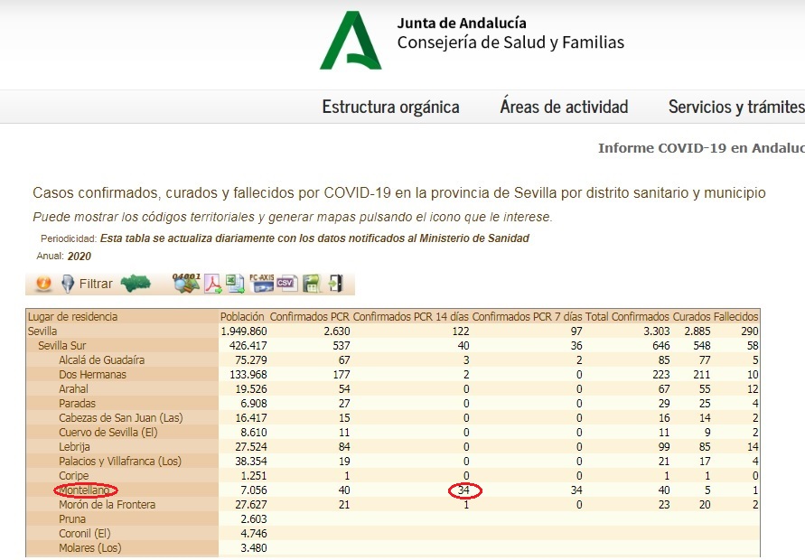 #COVID19 En el día de hoy se han actualizado los datos relativos al número de contagiados por COVID-19 en Montellano, siendo la cifra de 34 en los últimos 14 días. En este sentido, nos gustaría aclarar que estos datos, facilitados por la Delegación de Salud de la Junta de Andalucía, son a día de hoy los únicos datos oficiales de los que disponemos, pese a las informaciones publicadas por diferentes medios de comunicación y redes sociales durante el fin de semana.