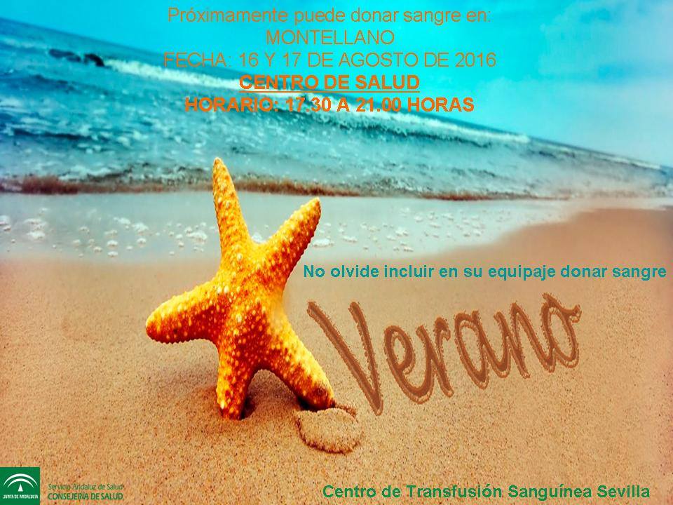 EL MARTES 16 Y MIÉRCOLES 17 DE AGOSTO habrá una campaña de donación de sangre en MONTELLANO. Será en EL CENTRO DE SALUD en horario de 17.30 a 21.00 horas. Se necesita sangre de todos los grupos sanguíneos.