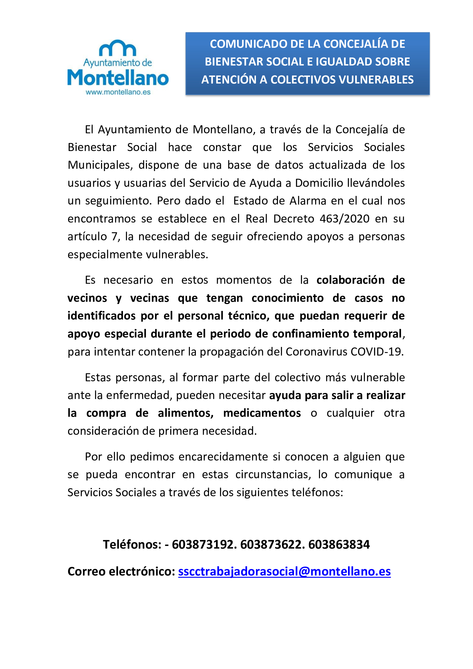El Ayuntamiento de Montellano, a través de la Concejalía de Bienestar Social hace constar que los Servicios Sociales Municipales, dispone de una base de datos actualizada de los usuarios y usuarias del Servicio de Ayuda a Domicilio llevándoles un seguimiento. Pero dado el Estado de Alarma en el cual nos encontramos se establece en el Real Decreto 463/2020 en su artículo 7, la necesidad de seguir ofreciendo apoyos a personas especialmente vulnerables.