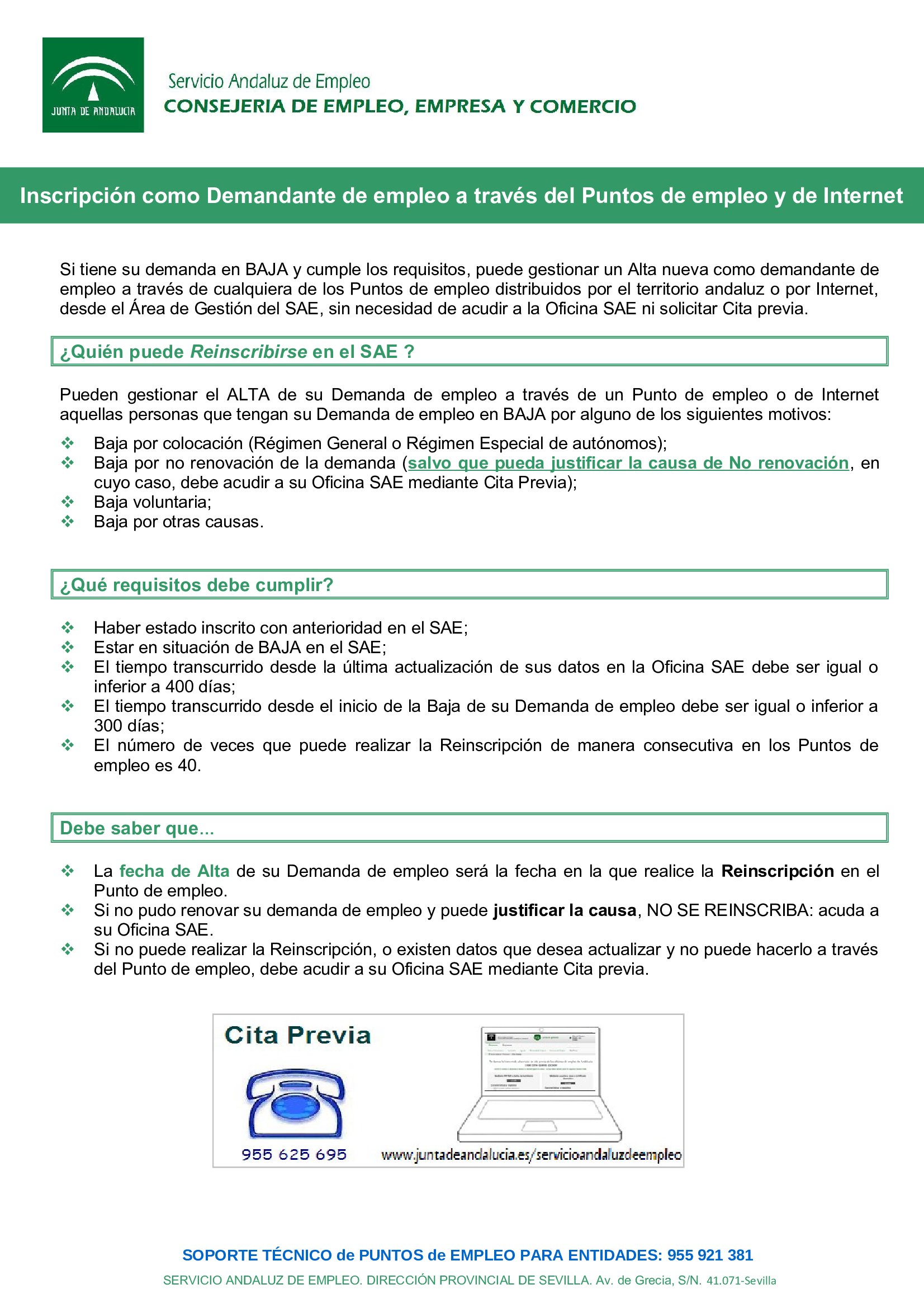 Si tiene su demanda de empleo en BAJA y cumple los requisitos, puede gestionar un Alta nueva como demandante de empleo a través de cualquiera de los Puntos de empleo distribuidos por el territorio andaluz o por Internet, desde el Área de Gestión del SAE, sin necesidad de acudir a la Oficina SAE ni solicitar Cita previa.
