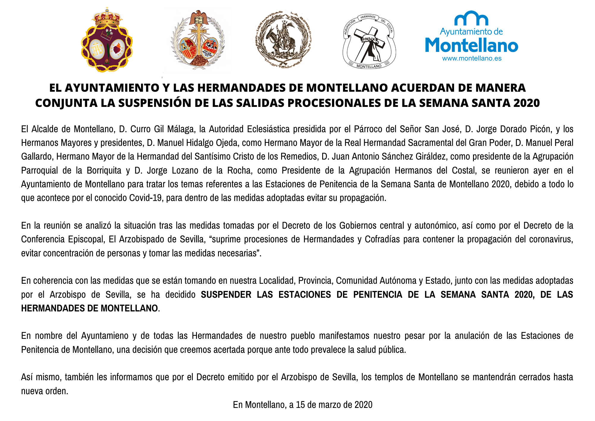 En coherencia con las medidas que se están tomando en nuestra Localidad, Provincia, Comunidad Autónoma y Estado, junto con las medidas adoptadas por el Arzobispo de Sevilla, se ha decidido SUSPENDER LAS ESTACIONES DE PENITENCIA DE LA SEMANA SANTA 2020, DE LAS HERMANDADES DE MONTELLANO.