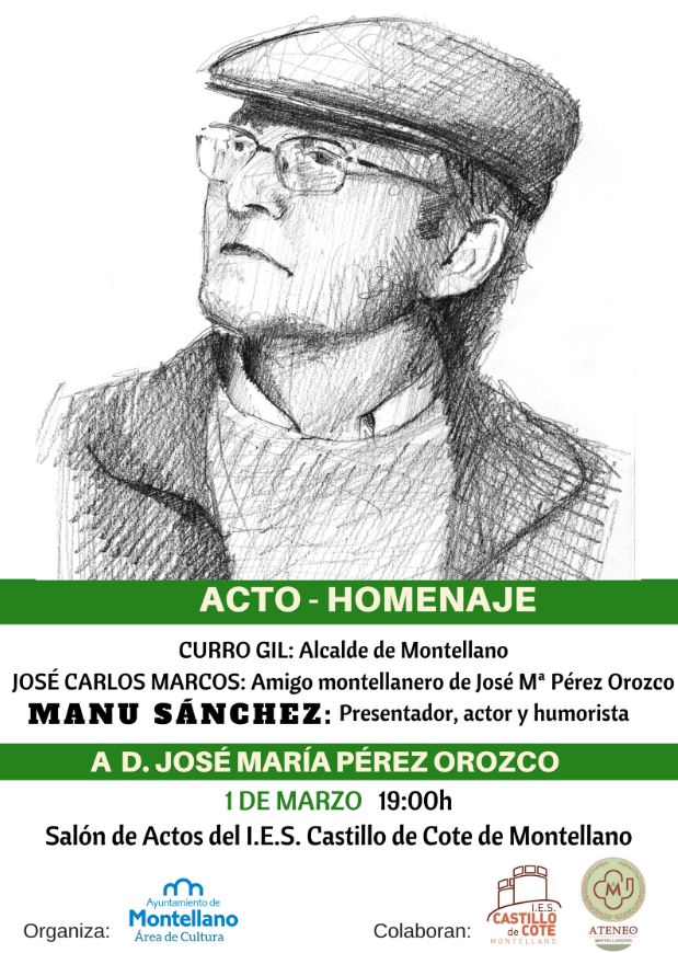 El homenaje tendrá lugar el próximo jueves 1 de marzo a las 19:00h en el Salón de Actos del IES Castillo de Cote. En el acto intervendrán el Alcalde Montellano, Curro Gil, un amigo de la infancia de José Mª Pérez Orozco, José Carlos Marcos, y el famoso actor y presentador, muy amigo también de Pérez Orozco, Manu Sánchez.