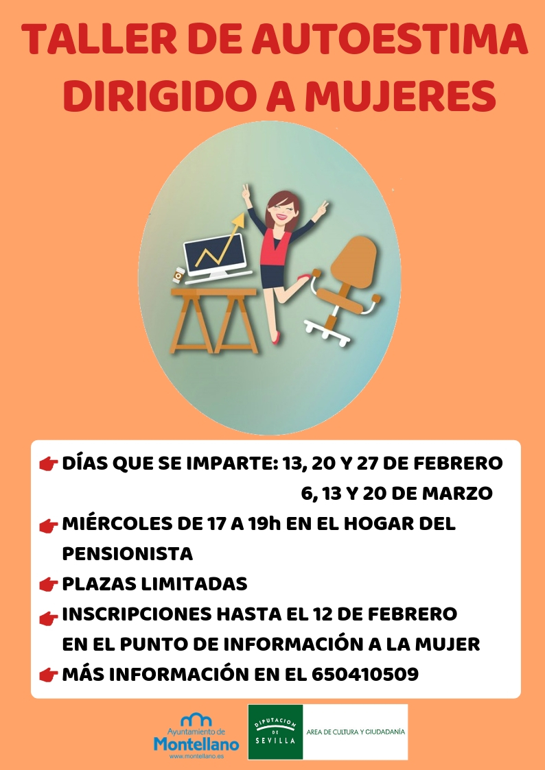 El Área de la Mujer del Ayuntamiento de Montellano organiza para el mes de febrero y el mes de marzo un taller de autoestima dirigido a mujeres. Si quieres aprender a quererte y a valorarte tal como eres participa en este taller y no dudes en ponerte en contacto con el área de la mujer en el teléfono 650410509.