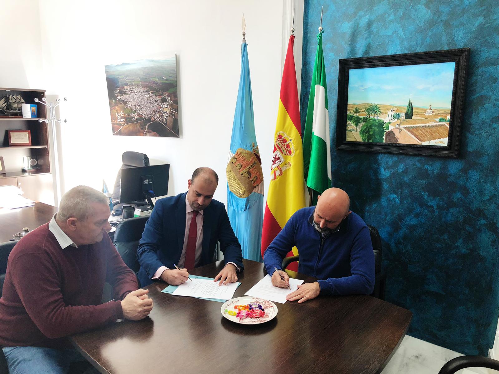 El alcalde, Curro Gil, y el nuevo director del Banco Santander de Montellano, Miguel Olmo, firmaron ayer un acuerdo por el que la entidad bancaria cederá al Consistorio las instalaciones que posee en las antiguas naves del taller de Isidoro para que pueda organizar los preparativos de la Cabalgata de Reyes 2019.