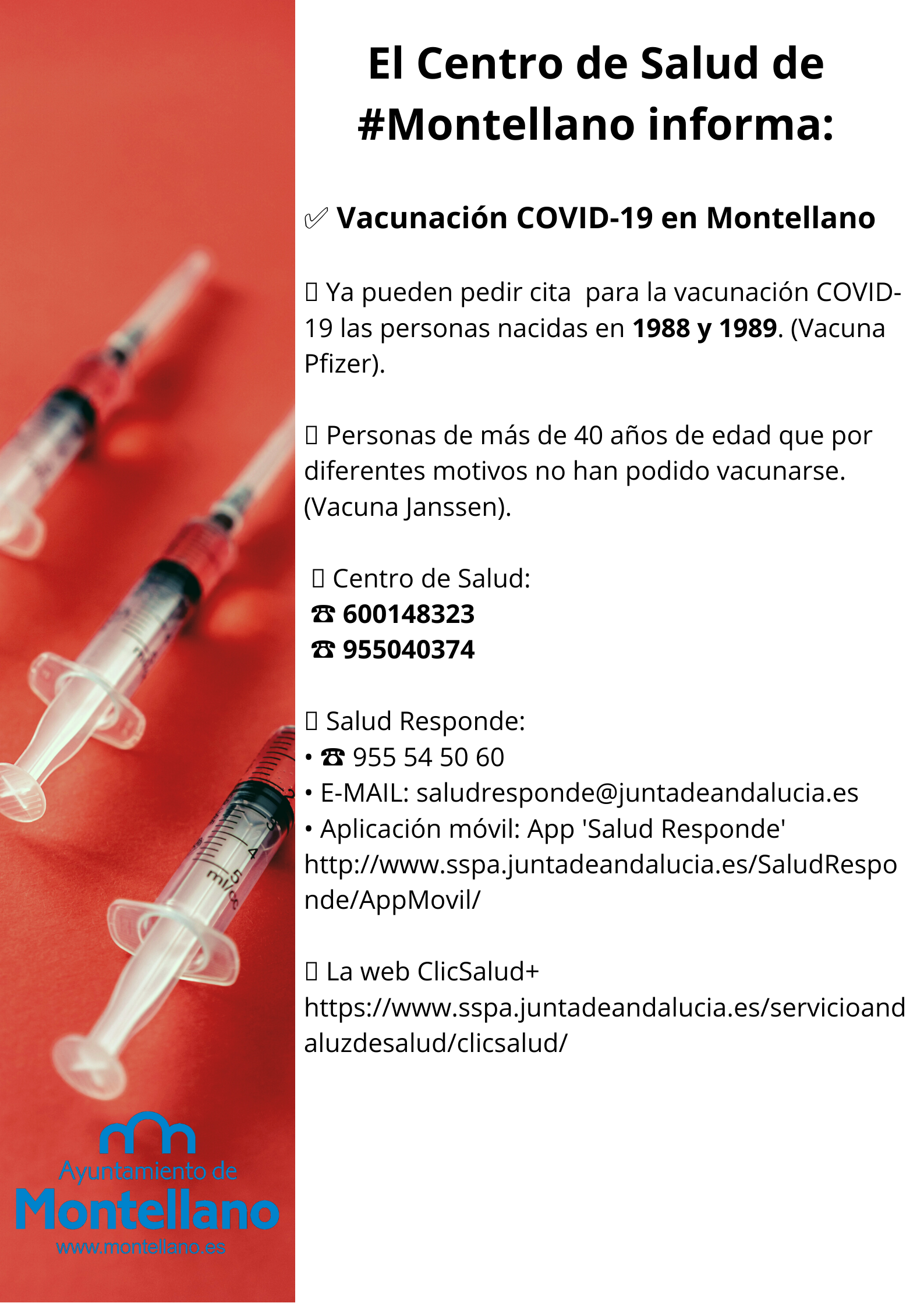 El Centro de Salud de Montellano informa sobre vacunación Covid-19 (1988-1989)