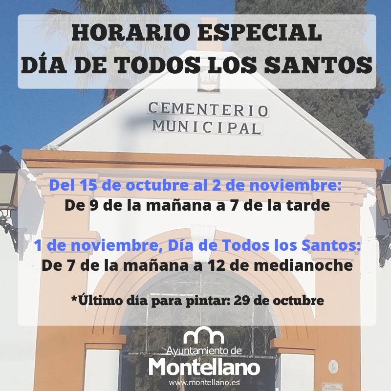 Les informamos que de cara a la festividad de los Santos, el Cementerio Municipal abrirá en horario de 9 de la mañana a 7 de la tarde hasta el próximo 2 de noviembre . No obstante, el día 1 de noviembre (día de Todos los Santos) su horario será de 7 de la mañana a 12 de la medianoche.