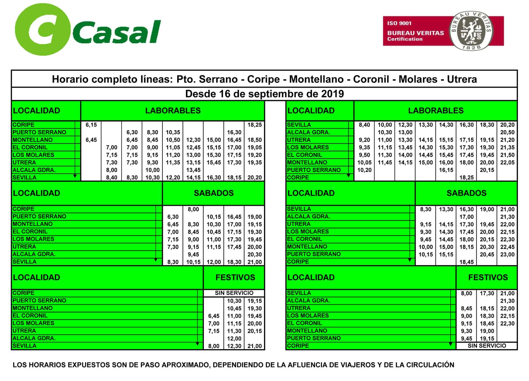 La empresa de Autobuses Casal informa sobre los nuevos horarios de la línea de Montellano.