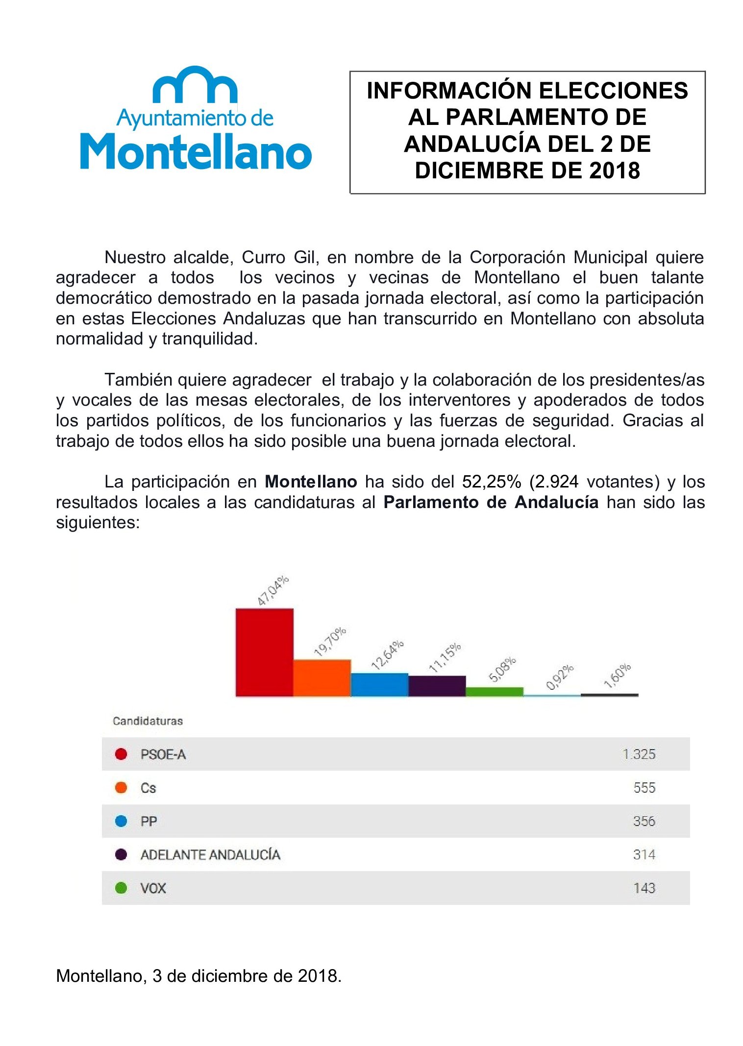 Nuestro alcalde, Curro Gil, en nombre de la Corporación Municipal quiere agradecer a todos los vecinos y vecinas de Montellano el buen talante democrático demostrado en la pasada jornada electoral, así como la participación en estas Elecciones Andaluzas que han transcurrido en Montellano con absoluta normalidad y tranquilidad.