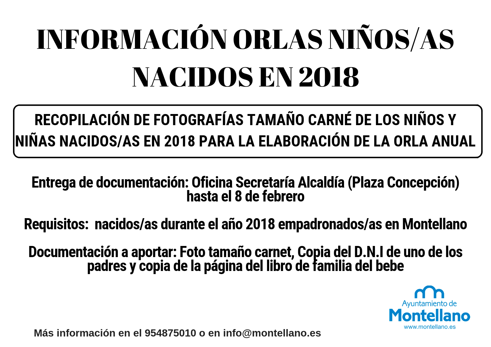 Se acerca el Día de Andalucía y como venimos haciendo desde hace años, el Ayuntamiento de Montellano hará entrega de una orla con los niños y niñas nacidos el año anterior. En ella se plasmarán las fotografías de los montellaneros y montellaneras nacidos en el 2018.