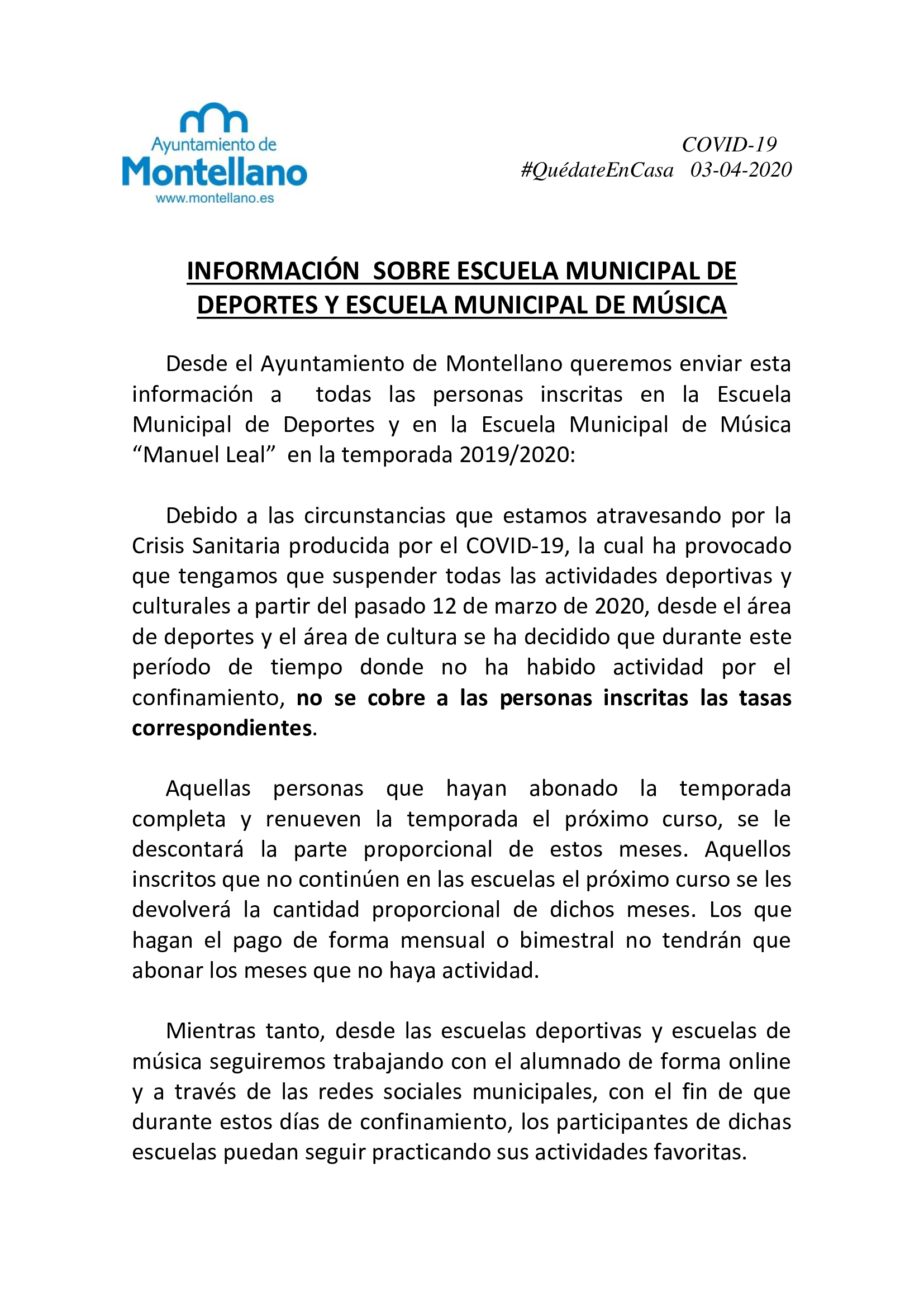 Desde el Ayuntamiento de Montellano queremos enviar esta información a todas las personas inscritas en la Escuela Municipal de Deportes y en la Escuela Municipal de Música “Manuel Leal” en la temporada 2019/2020: