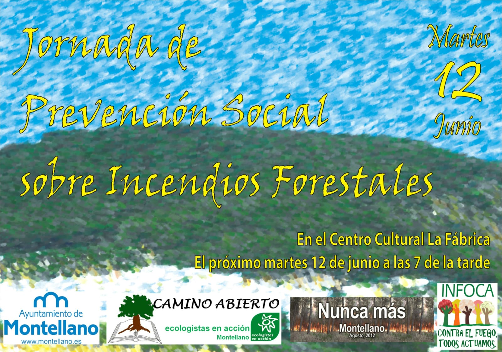 La Asociación Ecologista "Camino Abierto-Ecologistas en Accion" con la colaboración del Área de Medio Ambiente del Ayuntamiento de Montellano organizan una jornada sobre "Prevención Social en Incendios Forestales" el próximo Martes día 12 de Junio a las 19:00 horas en el Centro Cultural "La Fábrica". En dicha jornada se contará con la presencia del Técnico de Prevención y Participación Social adscrito al INFOCA de Sevilla el cual nos hablará de la problemática de los Incendios Forestales y nos dará detalles de todo los que está en nuestra mano para evitarlos y tener una mayor concienciación y sensibilidad ante estas catástrofes que tanto daño causan a la naturaleza .