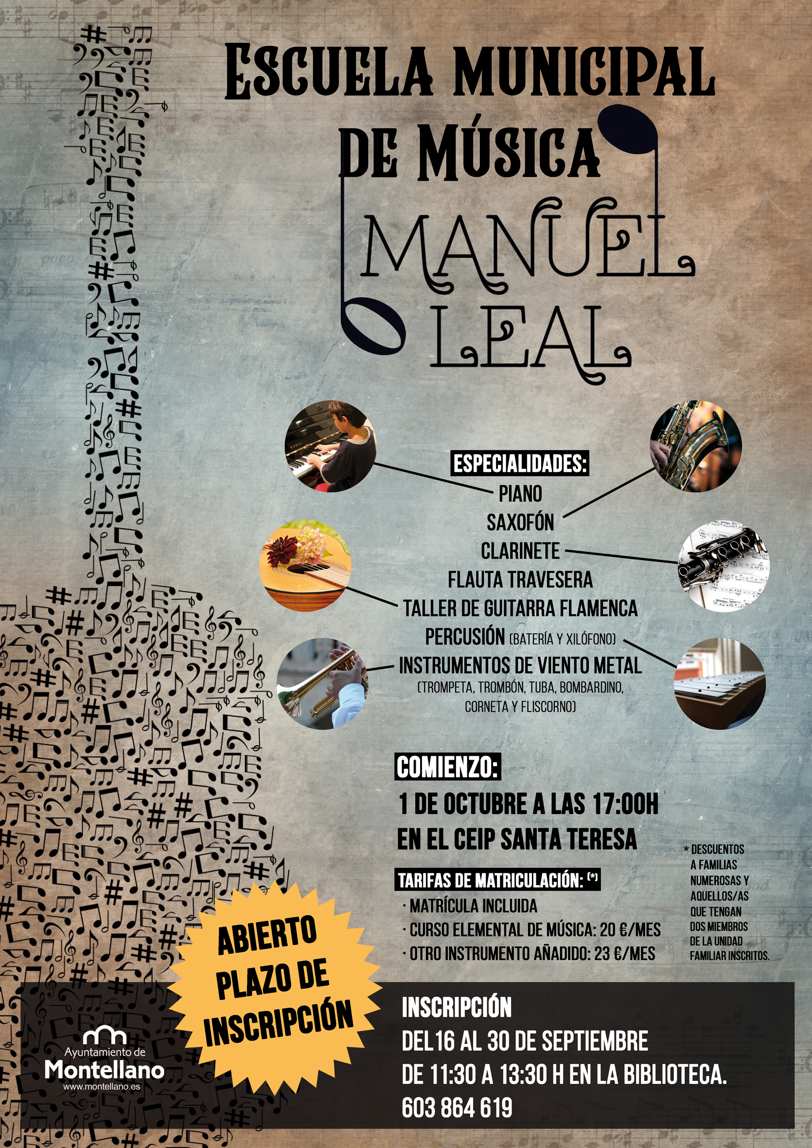 La Escuela Municipal de Música cuenta nuevamente con una amplia oferta académica para este curso, impartiendo las especialidades de piano, saxofón, clarinete, flauta travesera, taller de guitarra flamenca, percusión e instrumentos de viento metal. Las inscripciones se podrán entregar en la Biblioteca Municipal del 16 al 30 de septiembre en horario de 1:30 a 13:30 horas de lunes a viernes o bién llamando al teléfono 603 864 619. Los talleres comenzarán el 1 de octubre a partir de las 17:00 horas en el CEIP Santa Teresa.