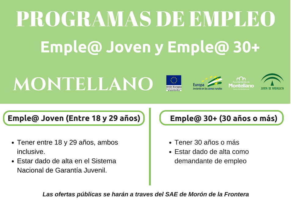 La Junta de Andalucía ha resuelto favorablemente al Ayuntamiento de Montellano la ayuda para la Iniciativa de Cooperación Social y Comunitaria Emple@Joven y Emple@30+. Concretamente se le ha concedido al Ayuntamiento de Montellano la cuantía de 263.900€ que irán destinados íntegramente a la contratación de 34 personas desempleadas que serán contratadas por un período de tiempo comprendido entre 3 y 7 meses.