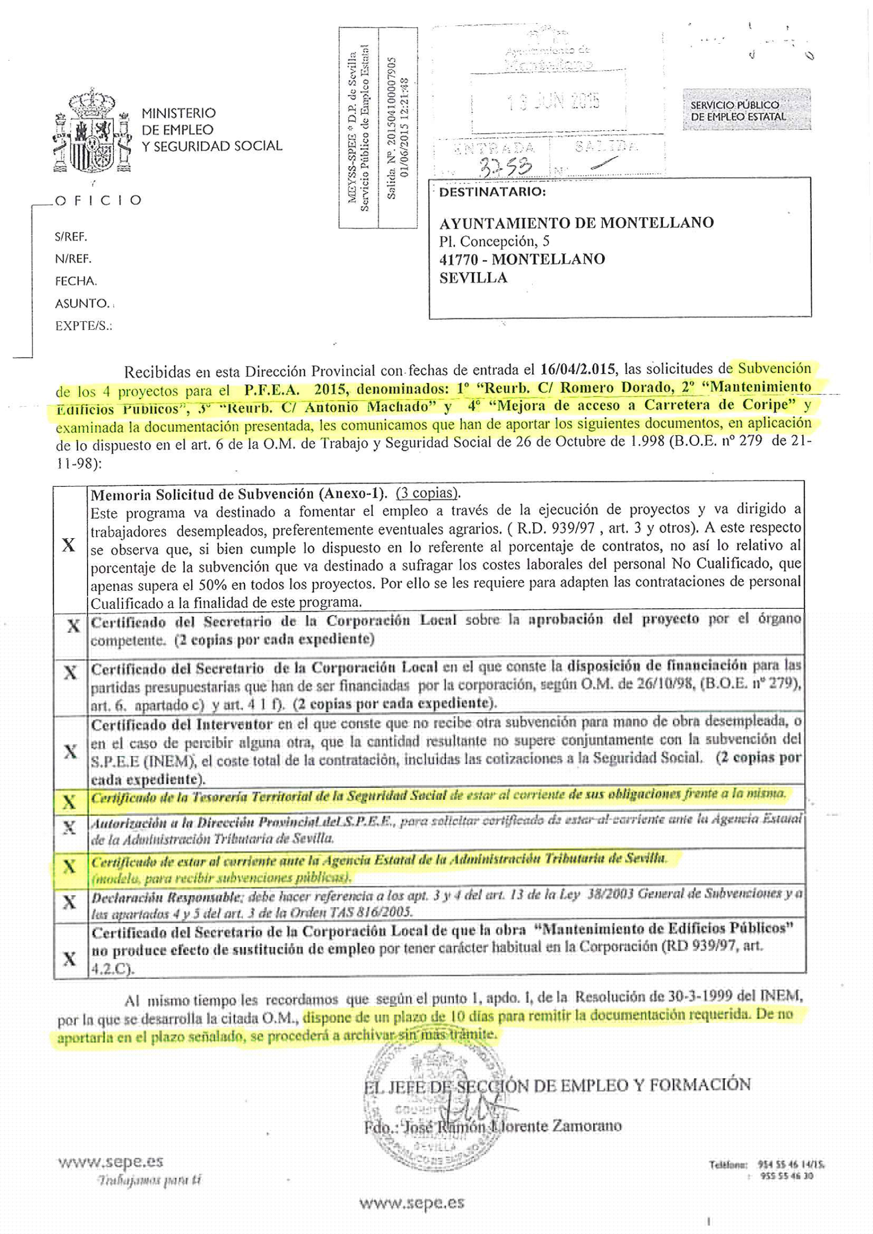 El impago de esta deuda con la Seguridad Social y el no estar al corriente con dicha Tesorería nos impide acogernos a día de hoy a esta subvención, PFEA 2015 (antiguo PER). Actualmente, desde el Ayuntamiento de Montellano se está trabajando para intentar solventar lo antes posible este problema y que podamos poner en marcha esta subvención. Adjuntamos el documento recibido hace unos días donde se nos pide la documentación mencionada y donde se puede apreciar que, si en un plazo de 10 días no remitimos la documentación, procederán a archivar la subvención.