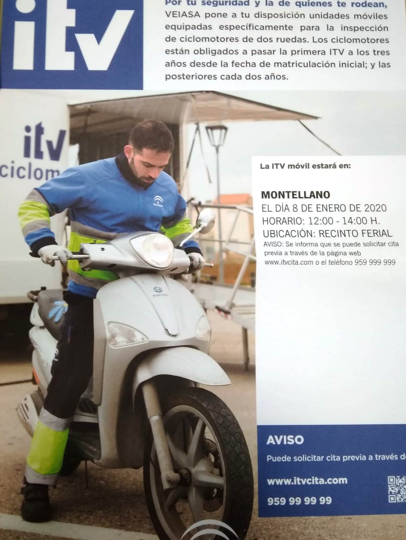 La nueva cita para pasar la ITV a los ciclomotores en nuestra localidad, ya tiene fecha, será el próximo día 8 de enero en el Recinto Ferial. Los horarios de atención al público serán, por la mañana desde las 12:00 a 14:00 horas.