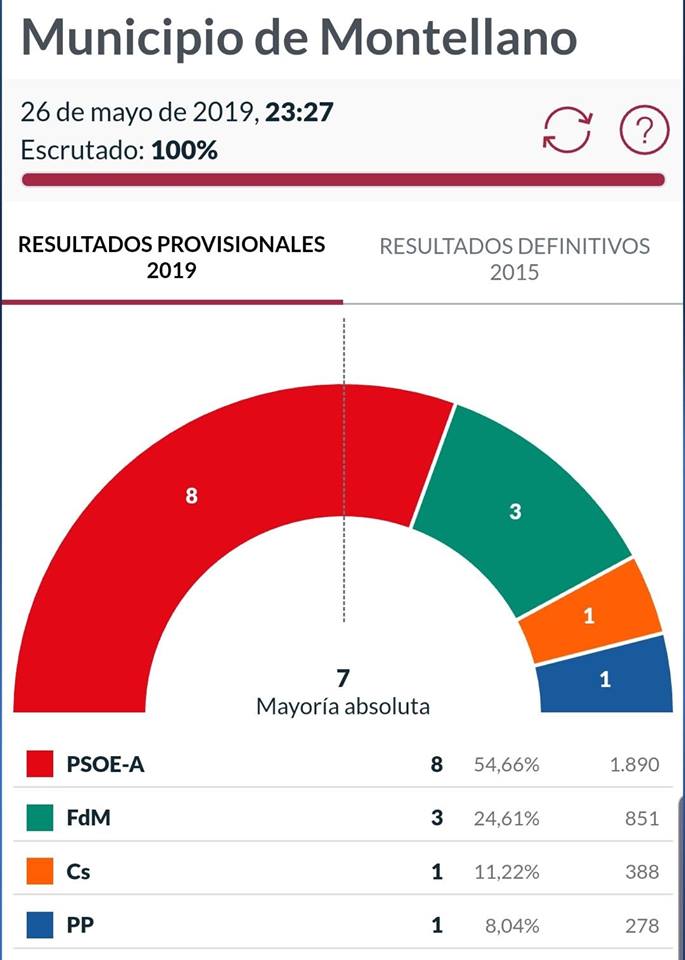 Los resultados en Montellano en las elecciones locales celebradas ayer fueron los siguientes: PSOE-A 1890 votos (8 concejales), FdM 851 votos (3 concejales), Cs 388 votos (1 concejal) y PP 278 votos (1 concejal). La participación fue del 62,48%. Toda la información se puede consultar en la web del Ministerio de Interior: https://resultados.eleccioneslocaleseuropeas19.es/…