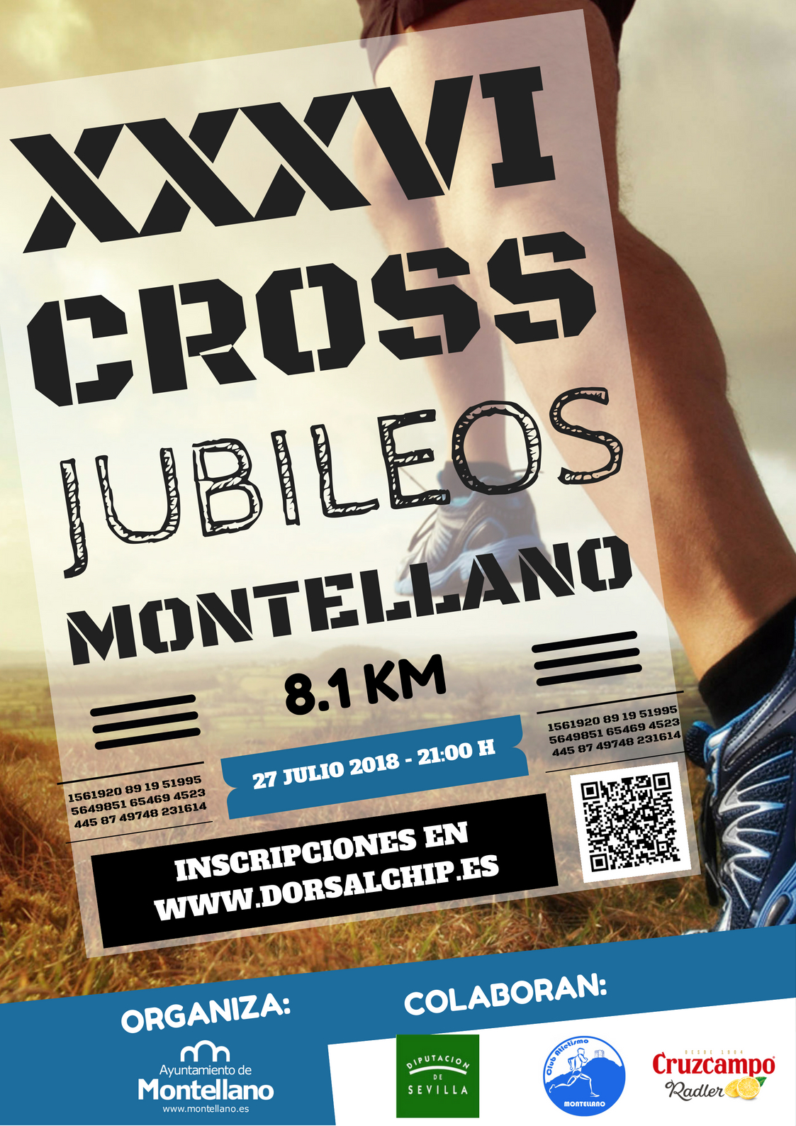 El próximo viernes 27 de julio se celebrará la XXXVI edición del Cross de Jubileos organizado por el Área de Deportes y con la colaboración del Montellano C. A. Montellano y la Excma. Diputación de Sevilla. La carrera de categoría absoluta tendrá lugar a las 21.00 h y constará de 8.1 Km de recorrido donde los corredores transcurrirán por las calles mas emblemáticas de nuestra localidad recorriendo el casco antiguo de la misma.
