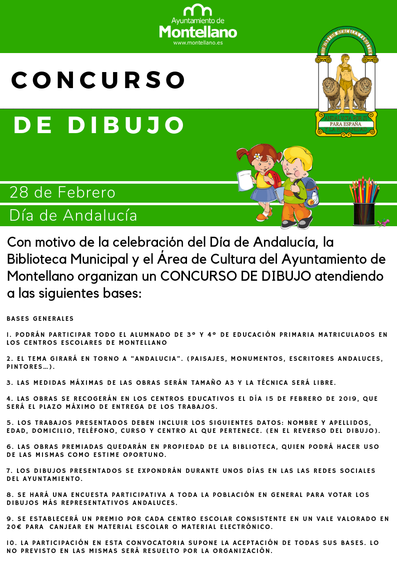 En el concurso han participado el alumnado de 3º y 4º de Primaria de los colegios de Montellano. Habrá tres seleccionados, y cada uno de los seleccionados recibirá un premio que le será otorgado en los actos del Día de Andalucía en la Carpa Municipal (28 de febrero).