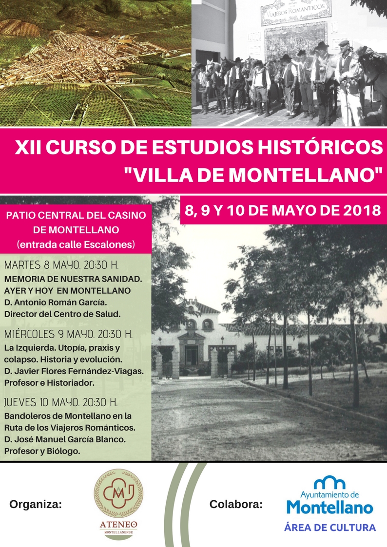 Los próximos días 8, 9 y 10 de mayo el Ateneo Montellano llevará a cabo la 12ª edición de los Cursos de Estudios Históricos "Villa de Montellano". La edición de este 2018, organizada una vez más con la colaboración del Área de Cultura del Ayuntamiento de Montellano, tendrán lugar en el Casino de la localidad (entrada por C/ Escalones), a partir de las 20:30 h.
