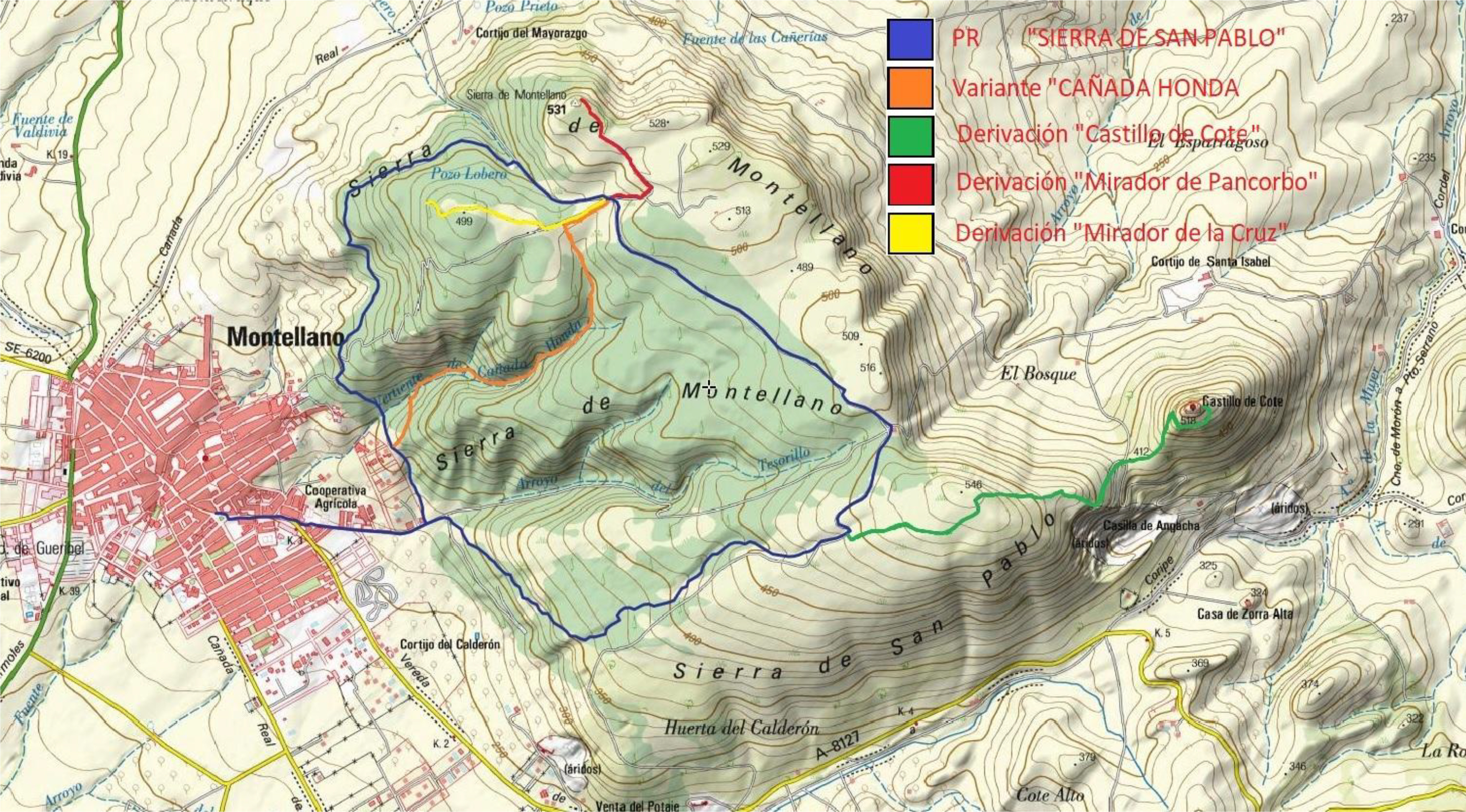 El sendero se inicia en la céntrica Av. de Ronda de la localidad de Montellano, desde donde nos encaminamos en dirección a la Av. del Tesorillo, la cual nos conducirá a las estribaciones de la Sierra de San Pablo. Nos adentramos en la naturaleza, justo en el punto donde el sendero se bifurca para su realización en un sentido u otro. En caso de optar por realizarlo en dirección contraria a las manecillas de un reloj, tendremos la opción al poco de tomar la bifurcación de optar por la denominada Variante “Cañada Honda” la cual nos lleva directamente al Área Recreativa de los “Llanos de la Romería”, y desde donde podremos acceder a visitar el Mirador de Pancorbo, el Mirador de Cruz, el conocido como Pozo Lobero o bien continuar el sendero. Si en la primera bifurcación optamos por seguir el sentido de las manecillas del reloj, alcanzaremos el conocido como Mirador de la Cancha, si continuamos podremos visitar y contemplar el singular Castillo de Cote, para luego continuar, si es nuestro deseo, hasta el Mirador de los Acebuches, desde donde tendremos una bonita óptica del Castillo de Cote, y donde también podremos continuar el sendero en dirección al Área Recreativa, cerrando posteriormente el bucle y concluyendo de nuevo nuestro sendero en el punto de inicio en Montellano.
